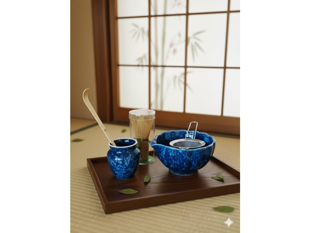 Krásná keramická sada na přípravu matcha. Najdete v ní - misku, sítko, naběračku čaje Chashaku, metličku  Chasen, a stojánek na metličku.