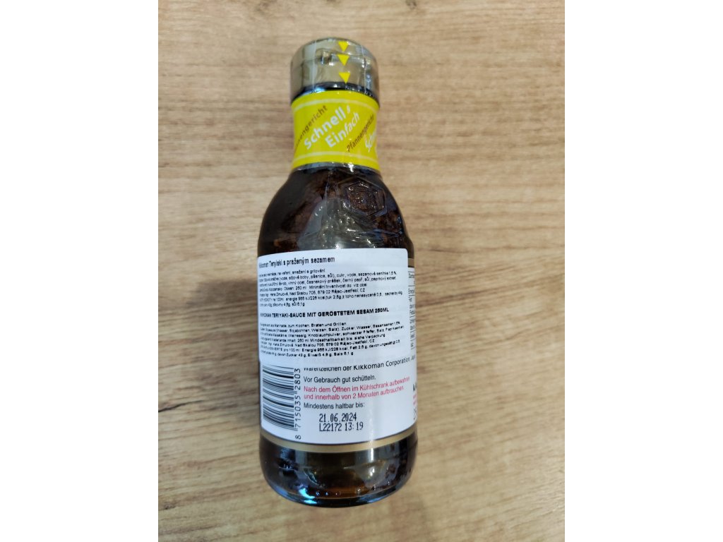 Složení: sójová omáčka (voda, sójové boby, pšenice, sůl), cukr, voda, sezamová semínka 1,6 %, modifikovaný kukuřičný škrob, vinný ocet, česnekový prášek, černý pepř, sůl, paprikový extrakt.