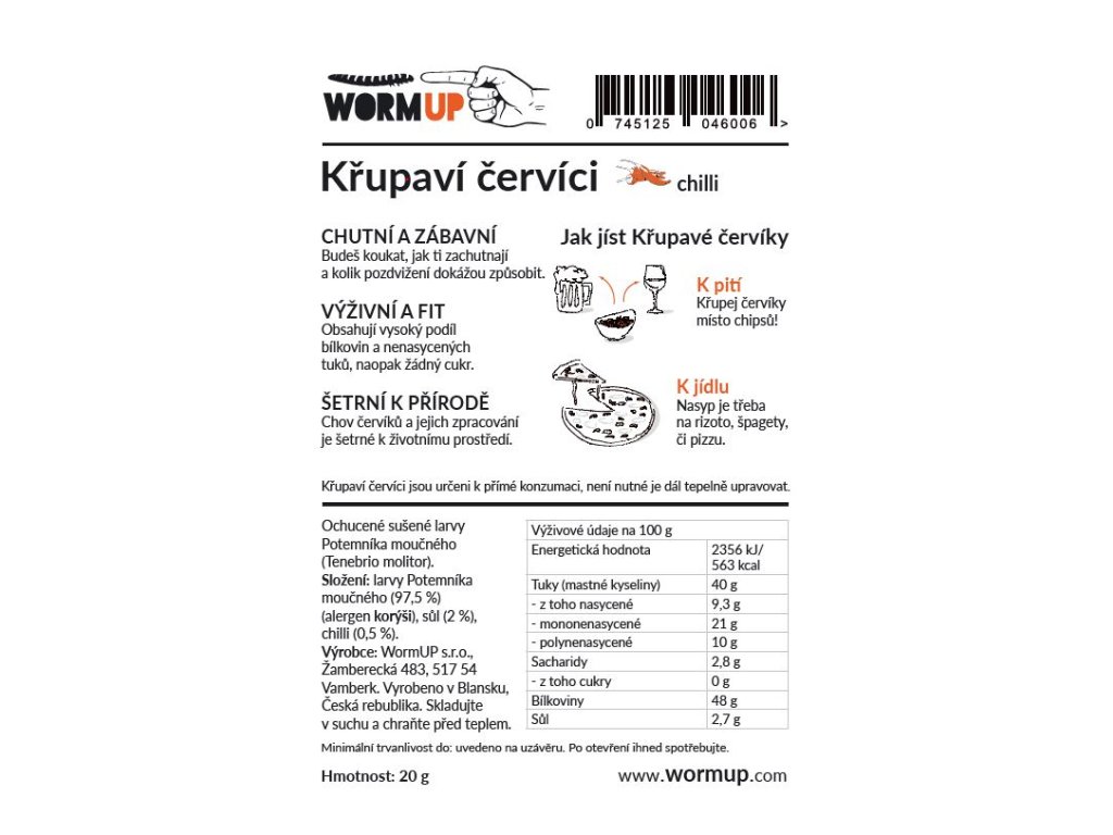 Červíci s chilli jako součást degustačního balení Křupavých červíků můžou být skvělým dárkem. Obdarovaný se tak seznámí i s dalšími variantami příchutí, a to jsou: kari, česnek, sůl a slaná skořice. Křupaví červíci jsou jedlý hmyz připraven k servírování, takže je stačí vysypat do misky a jíst.