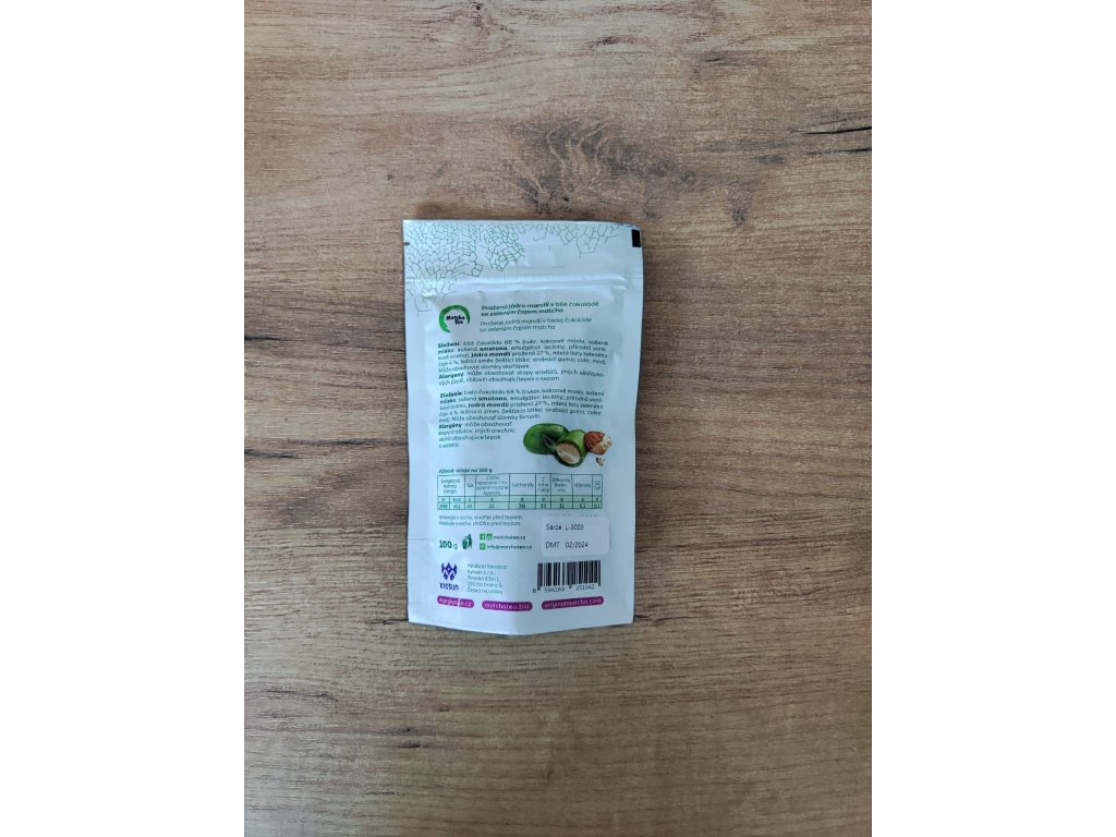 Složení: bílá čokoláda 68 % (cukr, kakaové máslo, sušené plnotučné mléko, sušená smetana, emulgátor: slunečnicový lecitin; přírodní vanilkové aroma), jádra mandlí pražená 27 %, mleté listy zeleného čaje 4 %, lešticí směs (lešticí látka: arabská guma; cukr, med) Může obsahovat stopy arašídů, jiných skořápkových plodů, obilovin obsahující lepek a sezam