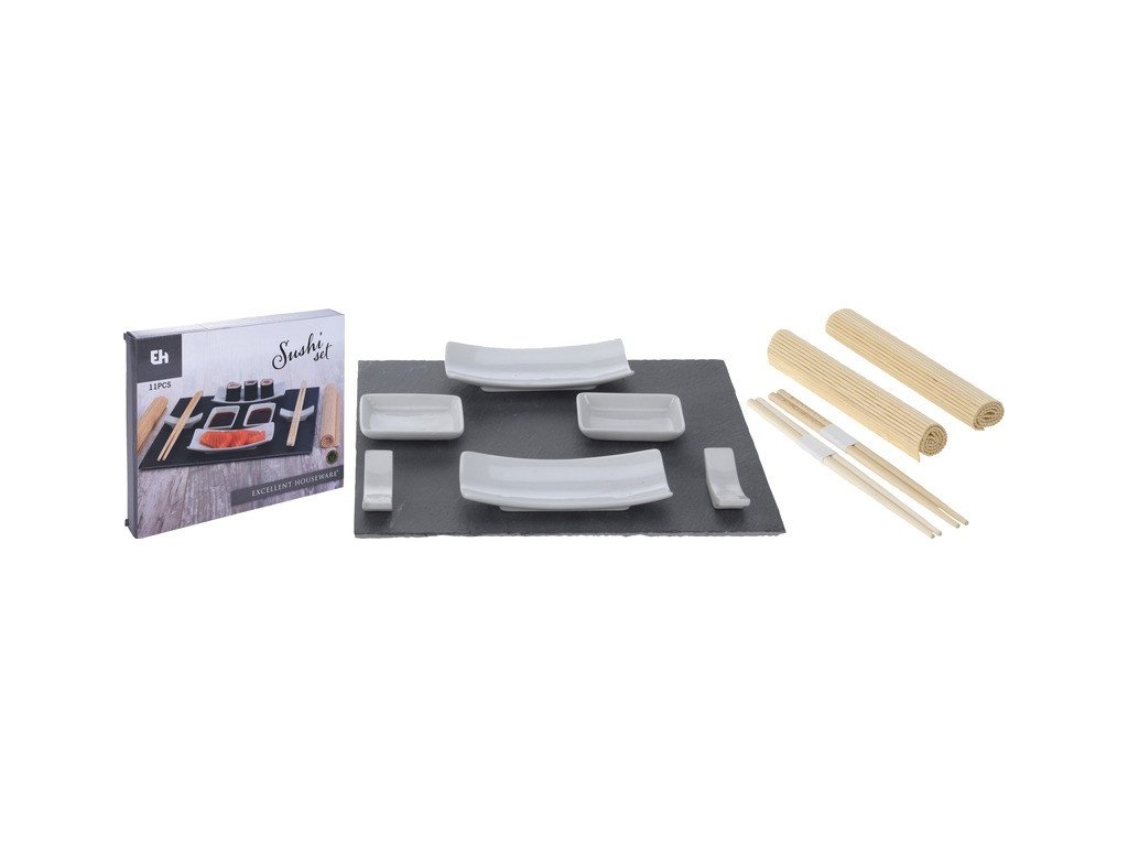 - břidlicová servírovací deska, nádoby z bílého porcelánu a bambusové hůlky i prostírání