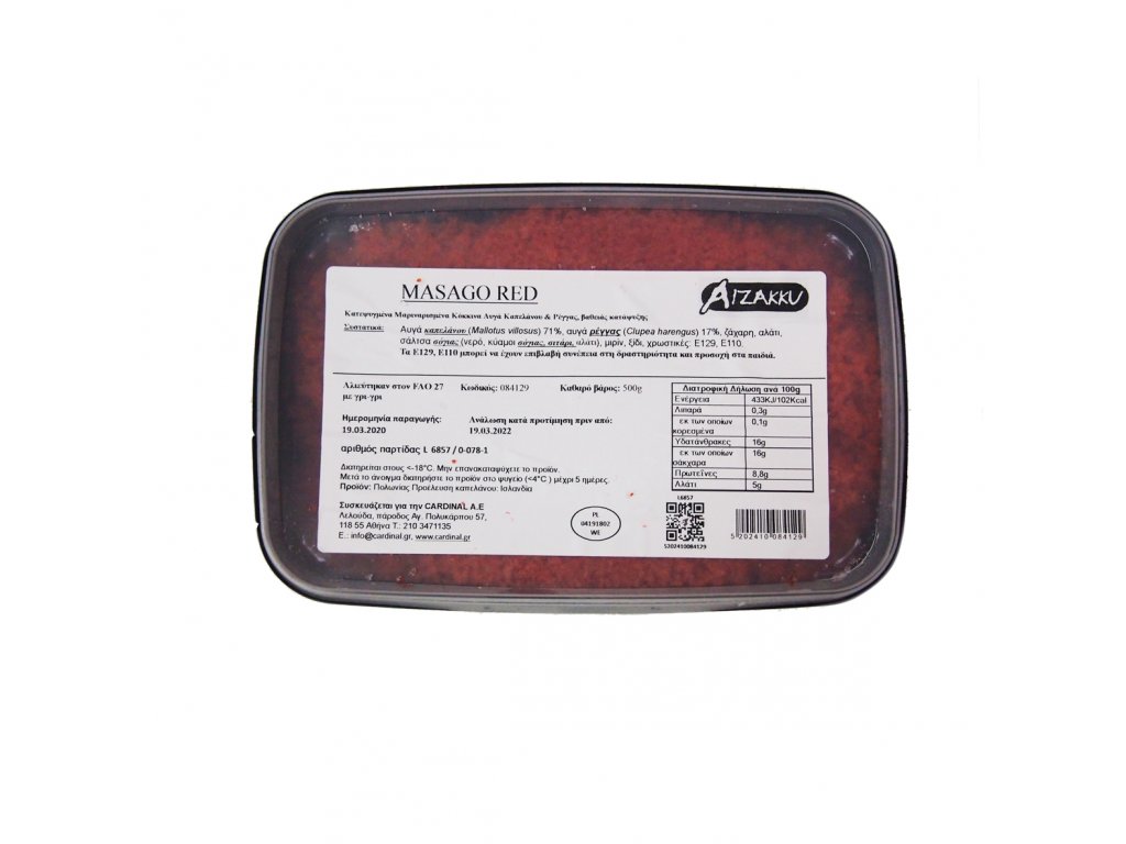 Složení: kaviár huňáčka(45%), kaviár sleďový (43%) cukr, sůl, sójová omáčka (voda, sója, pšenice, sůl), mirin (kukuřičný sirup, voda, rýžový ocet, koj rýže) konzervační látka, E202, barvivo: E 129, E110, E129, (může mít negativní dopad na činnost a pozornost dětí).
