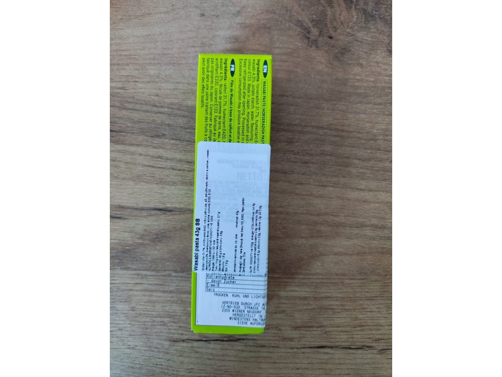 Složení: křen 31,7%, zvlhčovadlo E420, rýžový pálivý olej, sůl, zahušťovadlo: dextrin a xanthan, wasabi Japonica 4,5%, bramborový škrob, voda, aroma, kurkuma, E330, E133